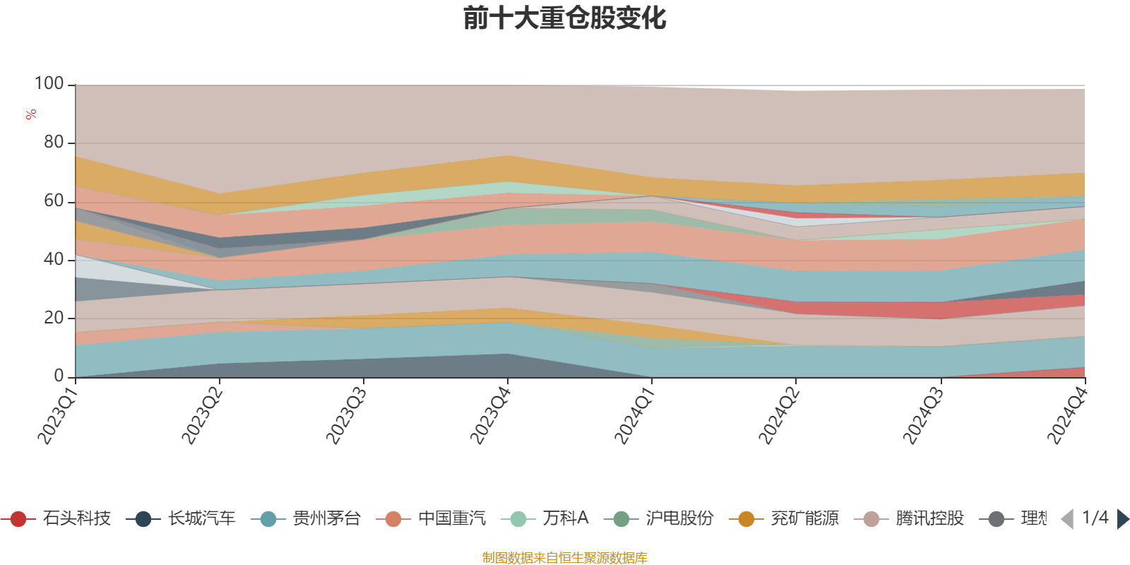 该基金持股集中度较高,近2年前十大重仓股集中度长期超过60%。截至2024年四季度末,基金十大重仓股分别是宁德时代、五粮液、腾讯控股、贵州茅台、紫金矿业、迈瑞医疗、洛阳钼业、亿纬锂能、山西汾酒、石头科技。